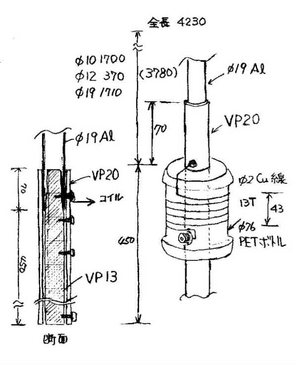 c).のエレメントは固定局で使用するには効率の関係から出来るだけ長くして、高いQのCoilを使いたいので、2mmの銅線でペットボトルに巻いた。Coilはエレメント長が2.67mの時には約16μH、3.78mの時に約13μHだった。(実際にはコイルを固定してエレメント長を調整した)
