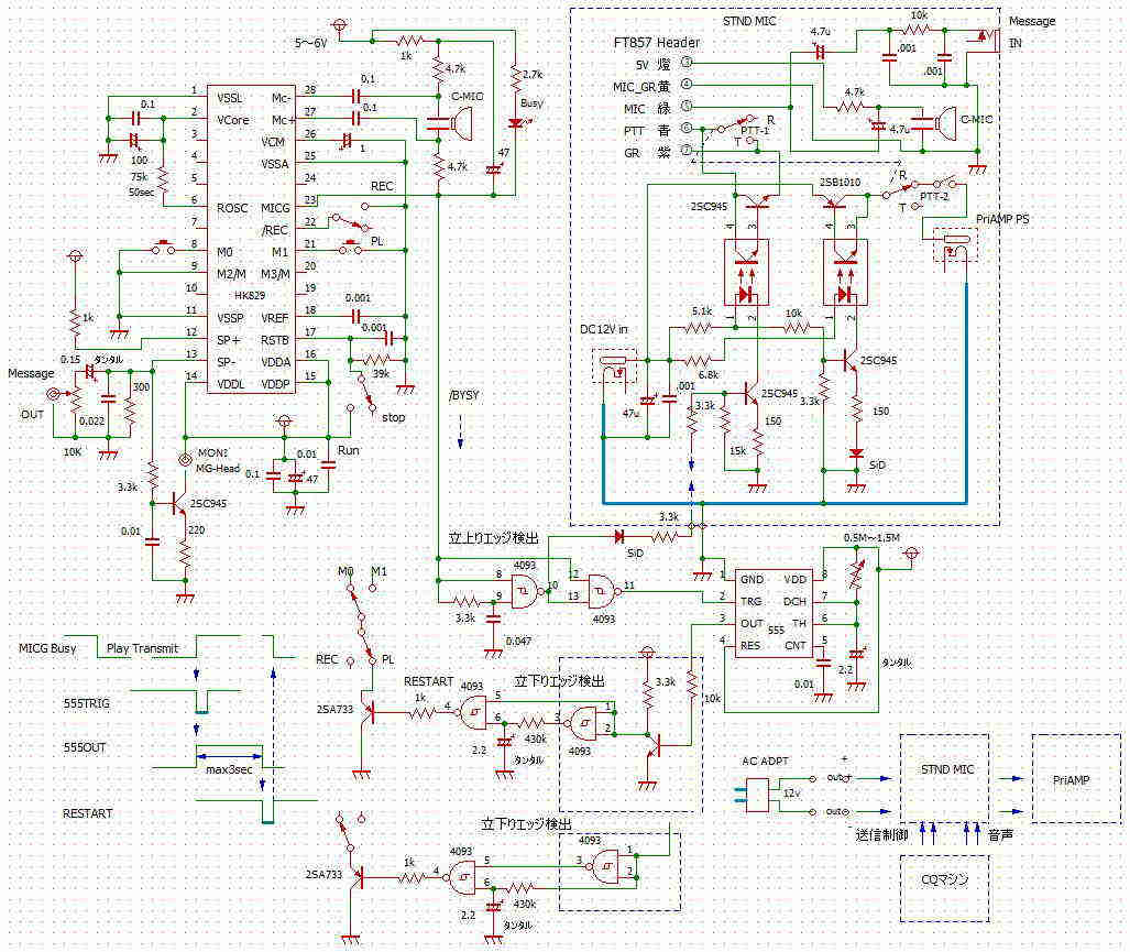 コロナの蔓延で日本橋に行くことも憚られた今夏、暇に任せてCQマシンを作ってみた。秋月でHK829他を購入して、以下の図のように組んでみた。電源はPCのUSBから供給するようにしてある。チャンネルは2つで、合計で約50Secの録音ができる。