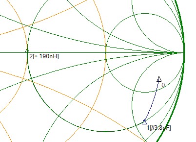 スミスチャートを使用しないとすれば、@ まず-j311を消すために直列に+j311(350nH)を挿入する。A 50Ωを252Ωに変換するLC回路(50Ω側から直列L100nH、252Ω側に並列C9pF)を接続する、という2段階(Tマッチ)しか当局では考えられなかった。]