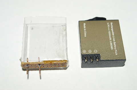 残りの1個を利用しようとPETシートと蛇の目基板を使ってケース作ってみた。接着にはUV硬化の樹脂を使う。接点のピッチは+-のみを使うのでピッタリと合うがBATTとの接続端子は1mmの銅線を折り曲げて幅を持たせ厚みをやすりで削って調整した。また基板にはんだ付けだけでは強度的に不安なので樹脂を厚く乗せてある。ケースからの取り出しにはBATTの底についている舌を引く。(PETケースを短くしても良かった?)
