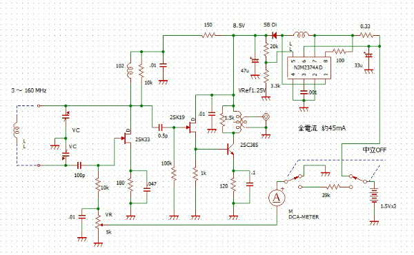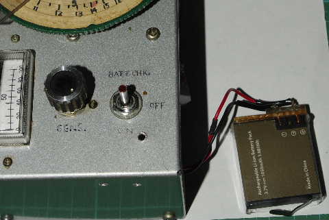 これをDipMeter(下図)の電源に取り付けた。元々006PのBATTを使っていたが、数年前にSWレギュレーターで昇圧回路を追加して単4、3本で運用していたので普通に使えている。尤も今はDipMeterとしての使用は無くANT調整用の発振器としてのみ使用している。