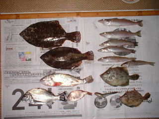 根掛りして昼までに2個の錘を無くした。一番左のI氏はベラとクジメとエソばかりという。