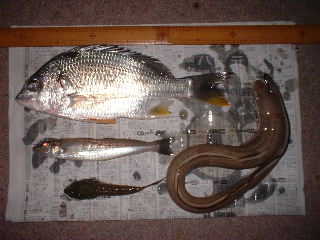 7時前にムラさんと私にアナゴが釣れ、7時15分頃には、小さいアタリでキビレの30cmが掛かって
