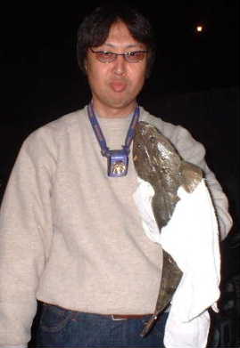 20時頃まつちゃんの竿が一度だけ大きくしなった。まつちゃんが釣り上げたのは43cmのマゴチ、