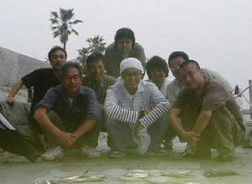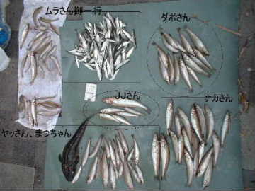 キス+豆アジ、鰯、サバの子を持って現れ、全員の釣果、集合写真を撮った。違う場所で釣っていても