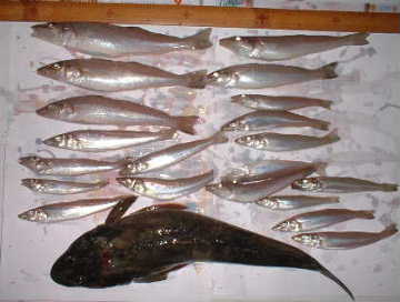 左:私とまつちゃんの釣果、キスは誰が何匹釣ったかわからない。大キス5匹は塩焼き、残りは天ぷら