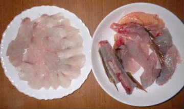 右:左の皿はマゴチの薄造り、右の皿は味噌汁の具になった。刺身、味噌汁共にこくがあり、