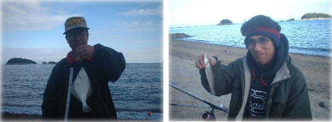 を頭にポツポツとキスが釣れた。右のSに28cm、ずっと右のフェリー乗り場のKに32cmのカレイが釣れただけで12時の
