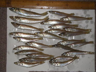 3時半頃に雨が降り出し、船小屋で雨宿りなどしながら、明るくなるまで、痛む腰で竿を振ったが、14cmくらいのキス1匹。