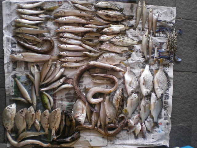 コメ・ムラ隊は、チビレ、縞イサギ、時々エイと頻繁に竿を曲げ、JJ,NAVIやんはキスを求めて移動。