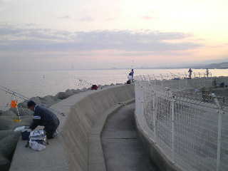 少し仮眠してから、淡輪の波止へ。すでに教授と迷人が来ていて、その両側にナカさんとA松さん。