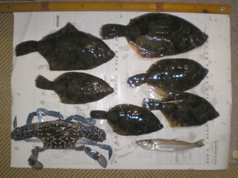SUSの針金がぐにゃぐにゃになった錘が戻ってきた。12時までやってカレイ6枚キス、渡蟹各1匹