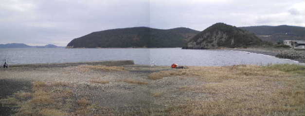 適当に散らばり竿を出したが釣れない。右のゴロタの浜の先に投げているY氏にはキスが来る。