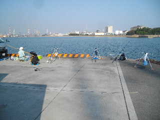 おじさんが一人いたが、すぐ横に船もあり、釣り場が狭かったので、コーナーに陣取った。すぐに