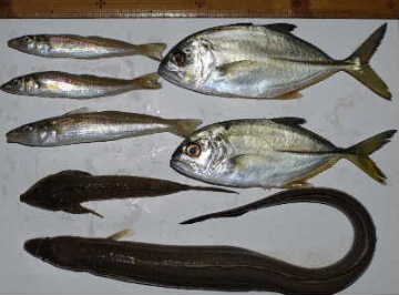 薄暗くなった16:30頃まで続き、納竿準備に入ったころにキス1匹追加し、最後の竿に大アナゴが掛り、掬ったヒラアジもあって
