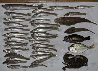 付いてこない。波止際で浮子を流してメバル小、タモでカニを掬い、まともに釣れたキス1匹とマゴチ