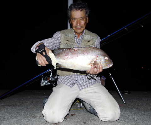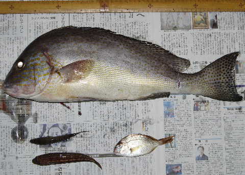 上がって来る迄は大アナゴかウツボかと思ったが、波止の下まで引いてきて初めて鯛系の魚と分かり、
