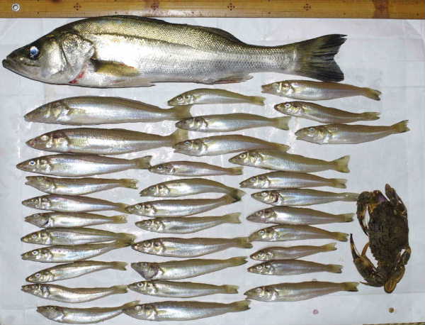 激しい当たりが出て、45cmのセイゴが釣れた。道糸PEPET1号ハリスナイロン1.5号のキス仕掛けに掛かり、切れやしないかと