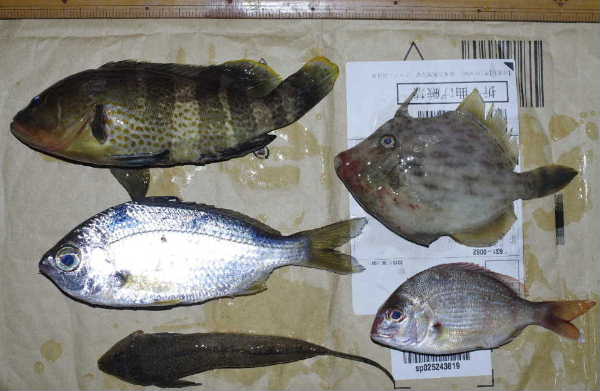 収まった頃に余り引きもなく重いだけのキジハタが釣れた。さらに右左と走るムギメシ、最後の最後17:30頃にハゲで