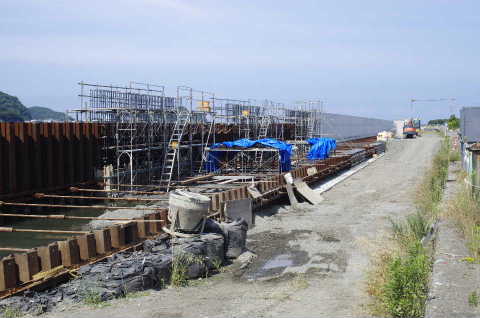 時間が十分あるので、一度自分の目で有田川の工事を見ておきたかったのでそのまま南下し、有田川に着いたのは9:30頃。この日は全サのキスの日だったらしく、川沿いには等間隔に投げ竿を持った釣り人が並ぶ。導流堤迄行ってみると写真のように高さ2.5m程のコンクリートの壁が出来ていた。このまま川沿いにずっとこの壁が並ぶと全く釣りは出来なくなり、益々釣り人に厳しくなりそうな。