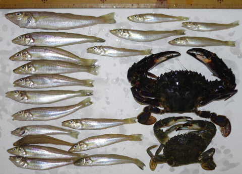 ゴミが海側に流れる中、早速竿を出したが最初に上がってきたのは小さなヒイラギ。12号の鉤の仕掛けを2本、キス仕掛けを2本セットしたが、明るい間にキス1匹のみ、暗くなってもほとんどアタリがない。結局暗い間はワタリカニ1匹を追加したのみ。02:00頃から仮眠タイム。