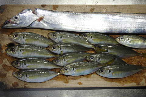 それでもサビキ仕掛けを用意して飛ばし浮を放り込むと第1投から浮が暴れてアジが4連で釣れた。今日も大漁かと思いきやすぐにアタリが遠のき、16時頃まででアジ10匹程で以後さっぱり。薄暗くなったころからタッチー仕掛けに替えても波は有るがアタリは無い。19時半過ぎにやっと1匹指3本位。その後もあまりにアタリが無いので、食品コンビナートに転進21時頃着。ここではアタリは有るものの乗らず、しかもエサが齧られていない。どうも太刀魚以外の魚が引いているようだ。齧られたのは2回程で0時頃までやって追加も無く撤収となった。