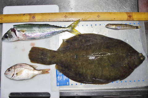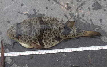10:00頃に精一杯投げていた竿にアタリが出た。今度はPE3号なので大丈夫と巻き上げるとやはり重いが、底にへばりつく様な感触は無く普通に上がって来たのは今シーズン初めての36.5cmのカレイだった。これからまだまだずっと潮が上がるので、期待したがその後はヒトデ、デカフグ、毛虫のみ。周りでは時々サビキの人が来てはちょっと竿を出して帰って行く。