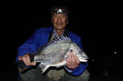 そろそろ潮止まりかなと思っていたが、相変わらず右へ流れていた竿のドラグが突然ジジジと鳴った。明らかに潮で流されている音とは違ったので、竿を持つとグングンと引く。慎重に引き寄せてタモに掬ったのは45cmのチヌ。大きなゴミが掛かるのでタモを用意しておいて良かった、と後で思った。
