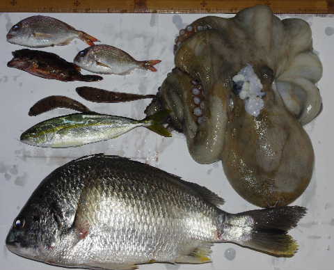 潮は大潮でそろそろ満潮の時間。右に流れるが強くはない。暫くして、12cm程のトラギス2匹が釣れ、その後テカミ、ハオコゼ、毛虫など全体に投げの場所ではないようだ。