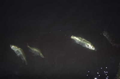 集魚灯を点けると陰になった処に魚の影が見える。鱸だろうと目検討で距離を合わせストロボを焚いて写真を撮ってみた。ハネサイズが横になって浮かんでいて、たまに寄ってくる小魚を食っているようだった。