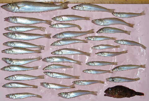 いつも15:00位が夕方のキスの時合と感じていたので、14:30頃から再開するが一向にアタリが無い。15:30を過ぎて潮が上がって来ているのが分るようになった16:00頃に遠投引き釣の竿にゴンゴンとしたアタリが出た。これはバラさないように慎重に巻き上げ、久しぶりに写真を撮ろうとメジャーを置いたら21.5cm。今日は余りに小さい物ばかり見ていたので、このサイズで舞い上がってしまった。結局それが最後のキスで、18:00過ぎの納竿まで波止際に入れた竿に掛かったミニガッシーを追加しただけだった。