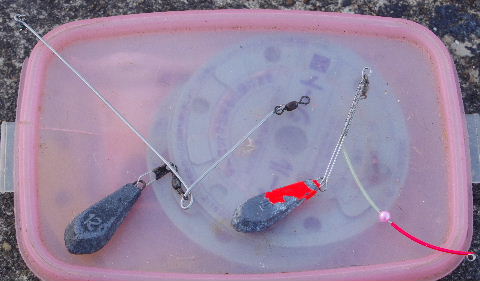 もう一本の竿もPE1.5号10号の錘でキス仕掛けで遠投するが、基本置き竿にはキスではなくテンコチかヒトデ。