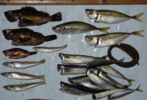 が釣れた。直ぐに暗くなってきて釣れるのは小鯖ばかり。先端のムラさんはそこそこアジが釣れるというので、先端へ移動。