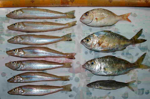 この浜はナビやん伝説の1つで、以前は釣り人やペンギンが沢山いたが、この日は全く"誰も居ない海"だ。少し仮眠してから岸壁を見に行き、空いていたコーナーから投げてみた。潮はもう底でボラ、木っ端グレ等が見える。以前の実績場所へ投げてみるが全く反応なし。エサもたくさん余っているので、青イソメに変えて投げたところチャリコが釣れた。さらにムギメシ、ベラなどが竿をふるわせて楽しませてくれたが、13時前にギブアップ。炎天下でコンガリ焼かれてしまった。