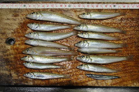 03:00頃から仕掛けを用意して投げてみるが何のアタリも無い。明るくなってきた頃から引き上げてみると付いていた状態で小さなキスが釣れた。今シーズン初めてなので一応確保する。08:00頃になっても涼しい風が吹き晴天なのに寒い位でアタリもなくキスがポツポツ付いてくる。魚体は冷たくもなくはっきりとしたアタリが感じられても良いのにと思う。09:00頃に隣のイカ師が2.5Kg程の大きなアオリイカを釣り上げた。この頃からはっきりしたアタリが出て、フグ、キュウセンが混じるようになり、それよりも控えめなアタリでキスが釣れた。が昼に向かってどんどんと潮が引き始め、徐々に元々シブいアタリがさらに遠のく。さらに風が徐々に強くなり11時頃には時々突風が吹きしぶきが感じられるようになり、粘ってみたが13:00時過ぎに納竿とした。
