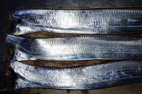 その間に、こちらは2匹。サビキはほとんど反応がなく直ぐに止めてしまった。深夜2時頃太刀魚仕掛けに引っかかってきたアジをエサにしたところ直ぐにアタリがあり、乗ったと思ったとたん高切れで、電気ウキと共に見えなくなってしまった。その後もサバと思われるアタリばかりで実際にサバが釣れた。