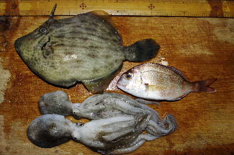 潮は目の前でよれていて良い感じで期待が持てる。7時頃に竿が激しく揺れドラグがジャーと鳴ってラインが出て行く。合わせを入れ巻き上げてゆくとゴンゴンと引く。あれれ思った通り何時ものデカフグだった。10分ほどして又同じようにラインが出てゆく。巻いてみると同じようにゴンゴンと引くが今度は上がって来ない。カレイか?と思ったら良型のハゲだった。その後はイイダコが釣れただけで9時過ぎには潮のよれは無くなり右に流れ出しアタリが無くなった。