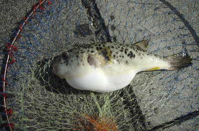 深夜に現着しコーナーを確保して、夜明けから日没まで、潮は9時頃が底で15時前にかけてずっと上げて来る。エサは確実に取られるのでエサ取りが湧いている様子、時々激しく竿を揺らして、播磨のデカフグが上がってくる。仕掛けは全ててぶらー仕様なので、針を取られることは無いが飲み込んでいるのを外すのに手間が掛って仕方がない。